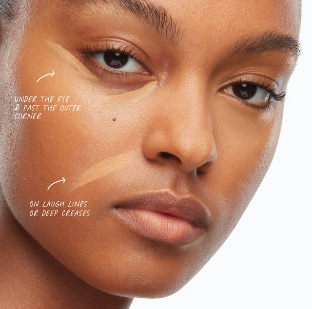 • ​Using a shade that matches your skin tone, apply to deep creases and laugh lines.​​